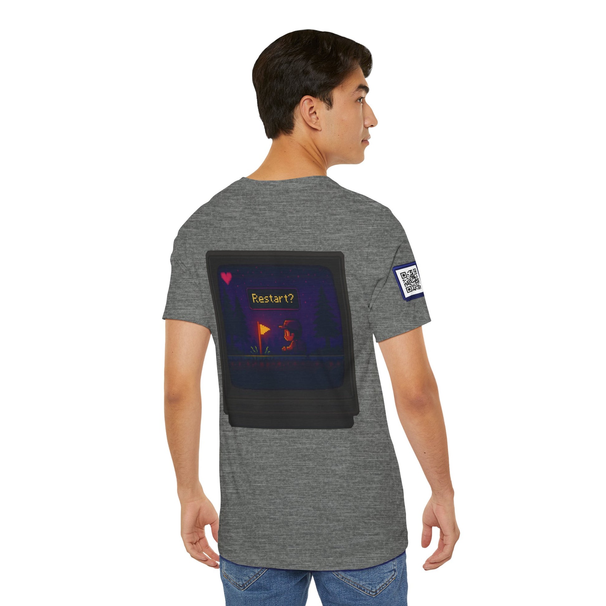 This pixel art side-scroller design captures that quiet but powerful moment of trying again — moving forward through shadows, hesitation, and healing. “Restart” is a tribute to resilience in a retro aesthetic. Whether you’ve hit pause, power down, or play again — this shirt meets you right where you are.